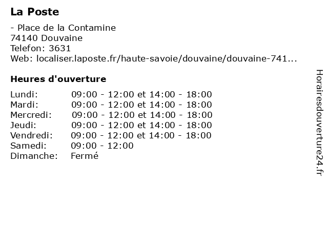 2 La Poste (Distance: 4,90 km) - Chemin Blossoniers, 74140 Veigy-Foncenex agence, assurance, banque, banque postale, bureau de poste, chronopost, colis, courrier, dps, expéditions internationales, la, point, postale, poste, relais, timbres, téléphonie, ups, western union 3 La Poste (Distance: 4,98 km) 5 Rue du Bourg, 74140 Messery agence, assurance, banque, banque postale, bureau de poste, chronopost, colis, courrier, dps, expéditions internationales, la, point, postale, poste, relais, timbres, téléphonie, ups, western union 4 La Poste (Distance: 6,54 km) 290 Route des Voirons, 74140 Machilly agence, assurance, banque, banque postale, bureau de poste, chronopost, colis, courrier, dps, expéditions internationales, la, point, postale, poste, relais, timbres, téléphonie, ups, western union 5 La Poste (Distance: 6,77 km) 2 rue Lou Margali, 74140 Excenevex agence, assurance, banque, banque postale, bureau de poste, chronopost, colis, courrier, dps, expéditions internationales, la, point, postale, poste, relais, timbres, téléphonie, ups, western union 6 La Poste (Distance: 8,16 km) 21 Rue de la Chapelle, 74140 Saint-Cergues agence, assurance, banque, banque postale, bureau de poste, chronopost, colis, courrier, dps, expéditions internationales, la, point, postale, poste, relais, timbres, téléphonie, ups, western union |