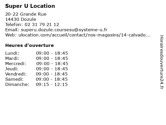 1 Super U Location (Distance: 11,45 km) . Route de Rouen, 14670 Troarn location, location de voiture, location de véhicules, super, véhicules 2 Super U Location (Distance: 16,26 km) . Route Nationale, 14800 Touques location, location de voiture, location de véhicules, super, véhicules 3 Super U Location (Distance: 19,26 km) - Route départementale 403, 14460 Colombelles alimentation, location, super, supermarché 5 CarGo Location de Véhicules DIVES SUR MER (Distance: 6,58 km) Avenue François Mitterrand, 14160 Dives-sur-Mer cargo, de, dives, location, mer, sur, véhicules 6 CarGo Location de Véhicules DIVES SUR MER (Distance: 7,59 km) 79 Rue du Général de Gaulle, 14160 Dives sur mer cargo, de, dives, location, mer, sur, véhicules |