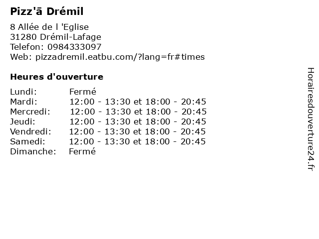 | Mardi | 12:00-13:30 et 18:00-20:45 |