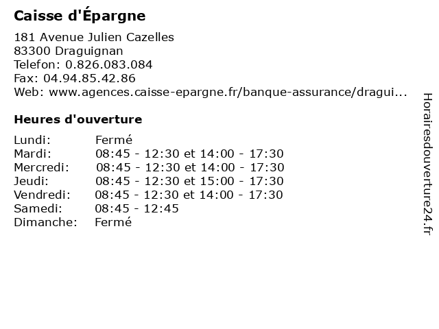 1 Caisse d'Épargne (Distance: 0,84 km) 1 Avenue Lazare Carnot,, 83300 Draguignan banque, caisse, carte, d'epargne, d'épargne, services 2 Caisse d'Épargne (Distance: 8,82 km) 485 Avenue des Treize Lorguais,, 83460 Les Arcs-sur-Argens banque, caisse, carte, d'epargne, d'épargne, services 3 Caisse d'Épargne (Distance: 11,26 km) 6031 Route Nationale 7, 83550 Vidauban banque, caisse, carte, d'epargne, d'épargne, services 4 Caisse d'Épargne (Distance: 16,29 km) 24 Avenue Général de Gaulle, 83520 Roquebrune-sur-Argens banque, caisse, carte, d'epargne, d'épargne, services 5 Caisse d'Épargne (Distance: 19,59 km) 183 Boulevard du Progrès, 83480 Puget-sur-Argens banque, caisse, carte, d'epargne, d'Épargne, d'épargne, services 6 Caisse d'Épargne (Distance: 19,61 km) 63 avenue Jean Jaurès, 83340 Le Luc banque, caisse, carte, d'epargne, d'épargne, services |