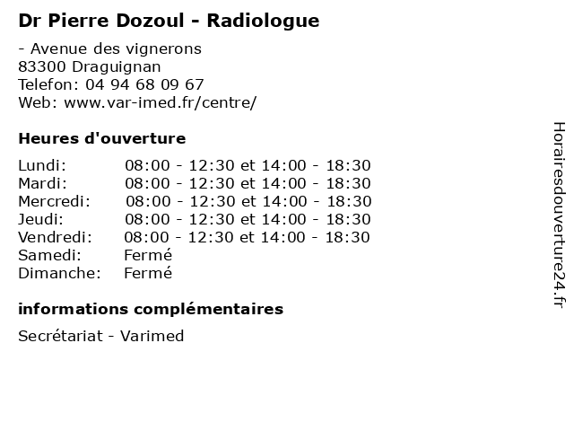 1 Dr Pierre Dozoul - Radiologue (Distance: 25,99 km) 147 Rue Jean Giono, 83600 Fréjus consultation, docteur, dozoul, dr, med, médecin, médecine, pierre, radiologue, traitement 2 Dr Pierre Dozoul - Radiologue (Distance: 27,59 km) 123 rue Waldeck Rousseau, 83700 Saint-Raphaël consultation, docteur, dozoul, dr, med, médecin, médecine, pierre, radiologue, traitement 3 Dr Laurent Caudmont - Radiologue (Distance: 0,00 km) - Avenue des vignerons, 83300 Draguignan caudmont, consultation, docteur, dr, laurent, med, médecin, médecine, radiologue, traitement 4 Dr Eric Guillemot - Radiologue (Distance: 0,00 km) - Avenue des vignerons, 83300 Draguignan consultation, docteur, dr, eric, guillemot, med, médecin, médecine, radiologue, traitement 5 Dr Ronan Juglard - Radiologue (Distance: 0,00 km) - Avenue des Vignerons, 83300 Draguignan consultation, docteur, dr, juglard, med, médecin, médecine, radiologue, ronan, traitement 6 Dr Ioana Mastora - Radiologue (Distance: 0,00 km) - Avenue des Vignerons, 83300 Draguignan consultation, docteur, dr, ioana, mastora, med, médecin, médecine, radiologue, traitement |