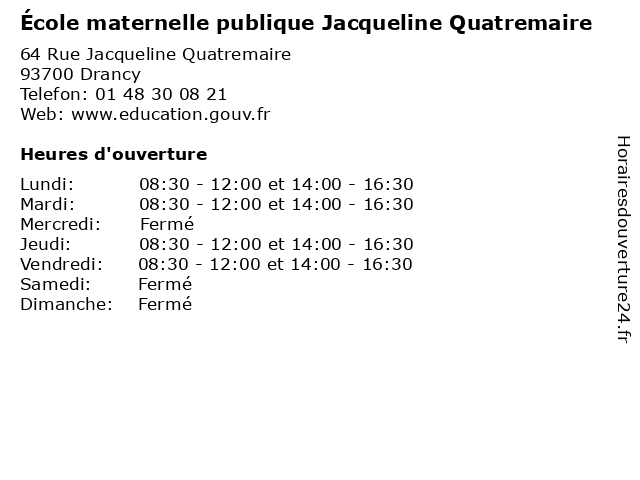 1 École maternelle publique Jacqueline Quatremaire (Distance: 3,51 km) 48 Avenue Division Leclerc, 93500 Pantin cours, education, jacqueline, maternelle, publique, quatremaire, services, École, école 2 École maternelle publique Jacqueline Quatremaire (Distance: 9,68 km) 11 Rue Carnot, 93430 Villetaneuse cours, education, jacqueline, maternelle, publique, quatremaire, services, École, école 3 École élémentaire publique Henri Quatremaire (Distance: 2,12 km) 18 Rue Baudin, 93130 Noisy-le-Sec cours, education, henri, publique, quatremaire, services, École, école, élémentaire 4 Crèche Collective Quatremaire (Distance: 3,34 km) 10 Boulevard Michelet, 93130 Noisy le Sec caregivers houses, child care, collective, crèche, family home, home care, kindergartens, micro-nurseries, parental home, quatremaire 5 Jacqueline Riu (Distance: 7,99 km) 44 Rue de la République, 93200 St Denis accessoires, bijoux, jacqueline, mode, riu 6 École maternelle publique Quatremaire (Distance: 13,40 km) 19 Raymond Brau, 77290 Mitry-Mory ecole, education, maternelle, publique, quatremaire, services, école |