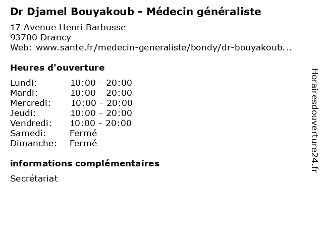 1 Dr Djamel Bouyakoub - Médecin généraliste (Distance: 2,94 km) 17 Avenue Henri Varagnat, 93140 Bondy bouyakoub, consultation, djamel, docteur, dr, généraliste, med, médecin, traitement 2 Dr. Djamel BERRAHAL - Angiologue (Consultation sur rendez-vous) (Distance: 4,32 km) 7 Avenue Henri Barbusse, 93156 Drancy angiologue, berrahal, consultation, djamel, docteur, dr., medecins, rendez, santé, sur, vous 5 Dr. Djamel Hamani - Cardiologie - Consultations (Distance: 13,56 km) 64 Rue Labrouste, 75015 Paris cardiologie, consultations, djamel, docteur, dr., hamani, medecins, sante 6 Dr. Djamel Hamani - Médecine générale(Consultation sur rendez-vous) (Distance: 13,57 km) 64 Rue Labrouste, 75015 Paris consultation, djamel, docteur, dr., générale, hamani, médecine, rendez, santé, sur, vous |