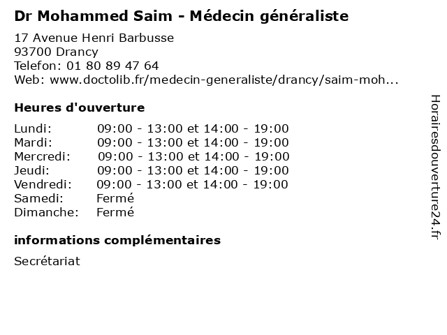 | Lundi | 09:00-13:00 et 14:00-19:00 |