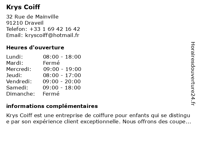 1 Opticien Krys (Distance: 0,42 km) 22 Place De La République, 91210 Draveil krys, magasin de lentilles correctrices, magasin de lunettes de soleil, magasin d’accessoires de mode, opticien, optométrie 2 Opticiens Krys (Distance: 2,81 km) 37 Boulevard Husson, 91170 Viry Chatillon femme, homme, krys, lentilles.lunettes, opticiens 3 Sido Coiff (Distance: 2,85 km) 20 Grande Rue, 91260 Juvisy-sur-Orge cheveu, coiff, coiffeur, coiffure, coloration, coupe, mèche, sido 4 Opticien Krys (Distance: 2,94 km) 48 Grande Rue, 91260 Juvisy-sur-orge krys, magasin de lentilles correctrices, magasin de lunettes de soleil, magasin d’accessoires de mode, opticien, optométrie 5 Opticiens Krys (Distance: 2,94 km) 48 Grande Rue, 91260 JUVISY SUR ORGE femme, homme, krys, lentilles.lunettes, opticiens 6 Opticiens Krys (Distance: 6,66 km) - D'Yerres, 91800 Boussy St Antoine femme, homme, krys, lentilles.lunettes, opticiens |