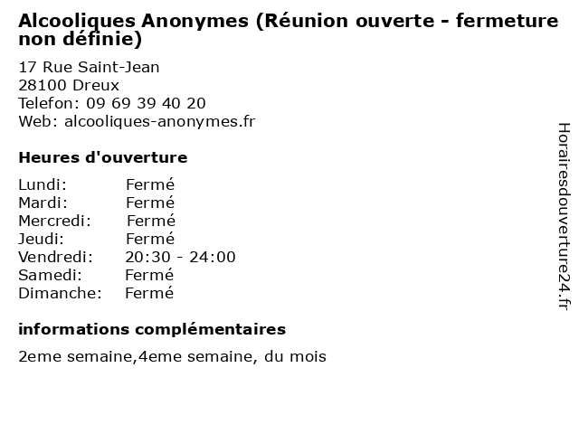 1 Alcooliques Anonymes (Réunion ouverte - fermeture non définie) (Distance: 17,87 km) 42 Rue de Paris, 78550 Houdan alcooliques, anonymes, définie, fermeture, non, ouverte, réunion 2 Alcooliques Anonymes (Réunion fermée - fermeture non définie) (Distance: 0,00 km) 17 Rue Saint-Jean, 28100 Dreux alcooliques, anonymes, définie, fermeture, fermée, non, réunion 4 Alcooliques Anonymes (Réunion fermée - fermeture non définie) (Distance: 17,87 km) 42 Rue de Paris, 78550 Houdan alcooliques, anonymes, définie, fermeture, fermée, non, réunion 5 Alcooliques Anonymes (Réunion fermée - fermeture non définie) (Distance: 39,18 km) 51 Rue Alfred Labarrière, 78440 Porcheville alcooliques, anonymes, définie, fermeture, fermée, non, réunion 6 Alcooliques Anonymes (Réunion fermée - fermeture non définie) (Distance: 39,48 km) - Place du Marechal Foch, 78760 Jouars-Pontchartrain alcooliques, anonymes, définie, fermeture, fermée, non, réunion |