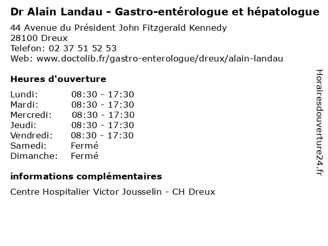 1 Dr Alain Landau - Gastro-entérologue (Distance: 0,11 km) 44 Avenue du Président John Fitzgerald Kennedy, 28102 Dreux alain, ch, dr, dreux, enterologie, entérologue, gastro, hepato, jousselin, landau, pancréatite, victor 2 Dr Alain-Patrick Regoli - Pédiatre (Distance: 1,27 km) 27 a Boulevard Louis Terrier, 28100 Dreux alain, dr, enfant, patrick, pediatre, pédiatre, regoli, sante, soins 3 Opticien Dreux | Alain Afflelou (Distance: 1,58 km) 10 Rue Saint Pierre, 28100 Dreux afflelou, alain, dreux, magasin de lunettes de soleil, magasin d’accessoires de mode, opticien, optométrie 4 Alain Afflelou - Acousticien (Distance: 1,59 km) 10 rue Saint-Pierre, 28100 Dreux acousticien, afflelou, alain, audioprothésiste, auditif, audition 5 Centre Drouais d' Hepato-Gastro-Entérologie - Medecine du Sport (secrétariat ) (Distance: 1,77 km) 3 place du Marché Couvert, 28100 Dreux centre, consultation, d', docteur, drouais, du, entérologie, gastro, hepato, medecine, santé, secrétariat, sport 6 Audioprothésiste Vernouillet-Alain Afflelou Acousticien (Distance: 1,81 km) Centre Commercial Hyper U, 28500 Vernouillet acousticien, afflelou, alain, audiologie, audioprothésiste, clinique médicale, vernouillet |