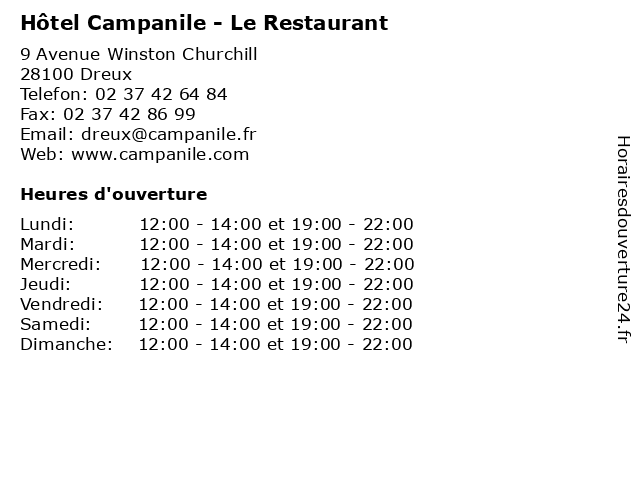 | Dimanche | 12:00-14:00 et 19:00-22:00 |