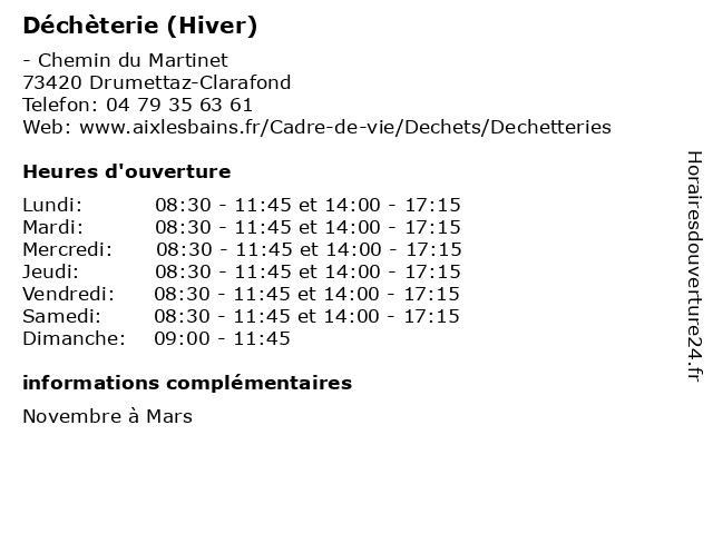 1 Déchèterie (Hiver) (Distance: 4,89 km) - ZA La Plaisse, 73370 Bourget-du-Lac bennes, collecte, déchets, déchèterie, détritus, gravats, hiver, tri 2 Déchèterie (Hiver) (Distance: 5,93 km) - Route Napoléon, 73100 Grésy-sur-Aix débarras, déchets, déchèterie, hiver, mars, novembre, poubelles 3 Déchèterie (Hiver) (Distance: 8,06 km) 57 rue du Pré Demaison, 73000 Chambéry bennes, collecte, déchets, déchèterie, détritus, gravats, hiver, tri 4 Déchèterie (Hiver) (Distance: 13,02 km) - route de Lucey, 73170 Yenne déchèterie, gravats, hiver, huiles usées, la réception des déchets et écocentres, les appareils électroménagers, les déchets verts, papier et carton en quantité 5 Déchèterie (Hiver) (Distance: 14,27 km) - Rue de la Deysse, 73410 Albens bennes, collecte, déchets, déchèterie, détritus, gravats, hiver, tri 6 Déchèterie (Hiver) (Distance: 17,44 km) - lieu-dit Leyat, 73630 Châtelard bennes, collecte, déchets, déchèterie, détritus, gravats, hiver, tri  |