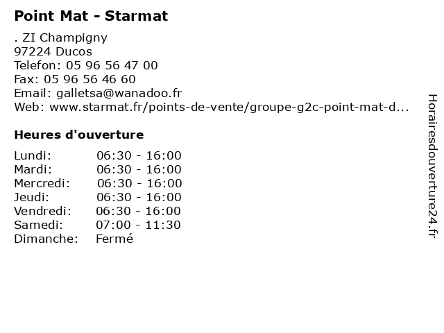 1 Point Mat - Starmat (Distance: 10,45 km) . Chemin Bonnaire, 97240 Le François charpente, isolation, mat, matériaux, menuiserie, outillage, point, starmat, toit 2 Leader Mat (Distance: 3,66 km) . Zone de Manhity, 97232 Le Lamentin carrelage, leader, mat, matériaux, menuiserie, outillage, sanitaires 3 Froid Mat Climatisation (Distance: 5,91 km) Californie Imm Camatchy, 97232 Lamentin (le) climatisation, froid, mat 4 Point Mat (Distance: 6,98 km) . Lotissement les Hauts de Californie, 97232 Le Lamentin charpente, isolation, mat, matériaux, menuiserie, outillage, point, toit 5 Distribois (Distance: 5,75 km) . Zone de Bois Quarré, 97232 Le Lamentin bois, charpente, distribois, fabrication, quincaillerie 6 Mérine Matériaux (Distance: 10,70 km) . quartier Four à Chaux, 97231 Le Robert charpente, isolation, matériaux, menuiserie, mérine, outillage, toit |
