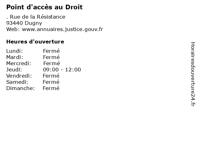1 Point d'accès au Droit (Distance: 5,22 km) . Rue de la Gaïté, 93000 Bobigny au, d'accès, droit, point, public, services 2 Point d'Accès au Droit (Distance: 5,37 km) 1 Rue Auguste Renoir, 93600 Aulnay Sous Bois au, d'accès, droit, justice, point, public, services 3 Point d'Accès au Droit (Distance: 6,08 km) 119 Galerie Surcouf, 93600 Aulnay Sous Bois au, d'accès, droit, justice, point, public, services 4 Point d'accès au Droit (Distance: 6,47 km) 125 Rue Bellegrade, 93000 Bobigny au, d'accès, droit, point, public, services 5 Point d'accès au Droit (Distance: 8,31 km) 167 Rue de Paris, 93260 Les Lilas au, d'accès, droit, point, public, services 6 Point d'accès au Droit (Distance: 9,71 km) 8 Place François Mittérand, 93190 Livry au, d'accès, droit, point, public, services |