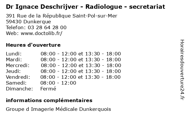 1 Dr Ignace Deschrijver - Radiologue - secretariat (Distance: 4,00 km) 300 Rue des Forts, 59210 Coudekerque-Branche deschrijver, dr, ignace, médecin, médecine, médical, pharmaceutique, radiologue, secretariat, traitement 2 Dr Aline Brasseur - Radiologue - secretariat (Distance: 0,00 km) 391 Rue de la République Saint-Pol-sur-Mer, 59430 Dunkerque aline, brasseur, dr, médecin, médecine, médical, pharmaceutique, radiologue, secretariat, traitement 3 Dr Jean-Bernard Cassan - Radiologue - secretariat (Distance: 0,00 km) 391 Rue de la République Saint-Pol-sur-Mer, 59430 Dunkerque bernard, cassan, dr, jean, médecin, médecine, médical, pharmaceutique, radiologue, secretariat, traitement 4 Dr Catherine Delattre - Radiologue - secretariat (Distance: 0,00 km) 391 Rue de la République Saint-Pol-sur-Mer, 59430 Dunkerque catherine, delattre, dr, médecin, médecine, médical, pharmaceutique, radiologue, secretariat, traitement 5 Dr Louis Denies - Radiologue - secretariat (Distance: 0,00 km) 391 Rue de la République Saint-Pol-sur-Mer, 59430 Dunkerque denies, dr, louis, médecin, médecine, médical, pharmaceutique, radiologue, secretariat, traitement 6 Dr David Fredoux - Radiologue - secretariat (Distance: 0,00 km) 391 Rue de la République Saint-Pol-sur-Mer, 59430 Dunkerque david, dr, fredoux, médecin, médecine, médical, pharmaceutique, radiologue, secretariat, traitement |