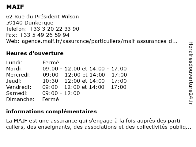 2 MAIF Assurances Dunkerque (Distance: 0,00 km) 62 Rue du Président Wilson, 59140 Dunkerque assurances, dunkerque, maif 3 MAIF Assurances Calais (Distance: 37,62 km) Boulevard la Fayette, 62100 Calais assurances, calais, maif |