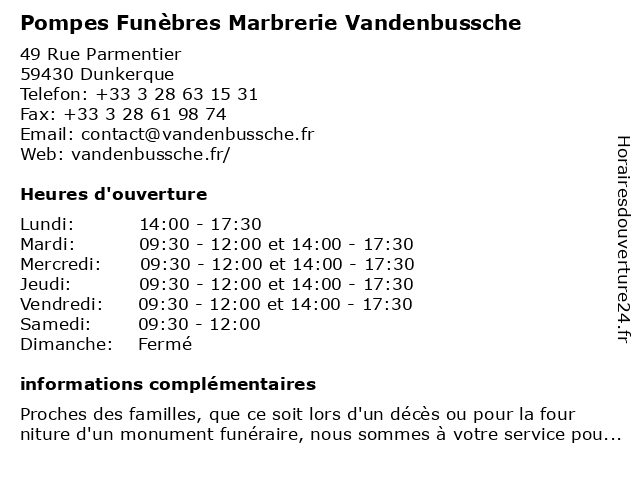1 Pompes Funèbres et Marbrerie Stopin (Distance: 0,71 km) 124 Rue de la République, 59430 Dunkerque avis de décès, crémation, entretien de sépulture, et, fleurs deuil, formalités après obsèques, funèbres, inhumation, marbrerie, monument funéraire, pompes, pompes funèbres, prévoyance obsèques, stopin 2 Pompes Funèbres et Marbrerie Stopin (Distance: 1,40 km) 124 Rue de la République, 59430 Saint Pol Sur Mer administration, assoc, associations, aux, bussières, d'information, de, des, dédié, et, funèbres, greffe, information, local, locale, mairie, marbrerie, mission, pompes, stopin 3 Pompes funèbres Vandenbussche (Distance: 2,64 km) 20 Route de Bergues, 59210 Coudekerque-Branche funèbres, pompes, vandenbussche 4 Ringot Pierre et Fils Marbrerie SA (Distance: 3,08 km) 93 Rue des Forts, 59210 Coudekerque-Branche et, fils, marbrerie, pierre, ringot, sa 5 Pompes Funebres Marbrerie Vandenbussche (Distance: 3,40 km) 1 Route de Furnes, 59210 Coudekerque-Branche funebres, marbrerie, pompes, vandenbussche 6 Pompes Funèbres et Marbrerie Stopin (Distance: 3,79 km) 15 Rue de l'Egalité, 59140 Dunkerque administration, assoc, associations, aux, bussières, d'information, de, des, dédié, et, funèbres, greffe, information, local, locale, mairie, marbrerie, mission, pompes, stopin |
