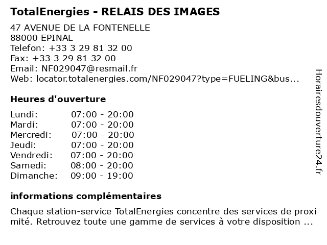 1 Office Notarial des Images (Distance: 1,62 km) 17 Rue François de Neufchateau, 88000 Epinal achat, borvin, bourquin, des, frances, images, laporte, location, notaire, notarial, office, vente, virtel 2 Arthurimmo.com - Images et Toits (Distance: 2,05 km) 6 rue Général Leclerc, 88000 Épinal agence, arthurimmo.com, et, images, immobilier, location, toits, transaction, vente 3 TotalEnergies - SWS (Distance: 6,18 km) 58 RUE D ALSACE STATION TOTAL, 88150 THAON LES VOSGES gas station, station service, sws, tankstelle, total, totalenergies 4 TotalEnergies - REL.LE BOIS DES CHENES (Distance: 17,20 km) N57, 88450 Vincey bois, chenes, des, gas station, rel.le, station service, tankstelle, total, totalenergies 5 TotalEnergies - SARL GARAGE DIDIER (Distance: 18,38 km) 500 ROUTE DE LEPANGES, 88600 LAVAL SUR VOLOGNE didier, garage, gas station, sarl, station service, tankstelle, total, totalenergies 6 TotalEnergies Access - REL.HAUTES VOSGES (Distance: 19,82 km) N57, 88200 Saint-Nabord access, gas station, rel.hautes, station service, tankstelle, total, totalenergies, vosges |