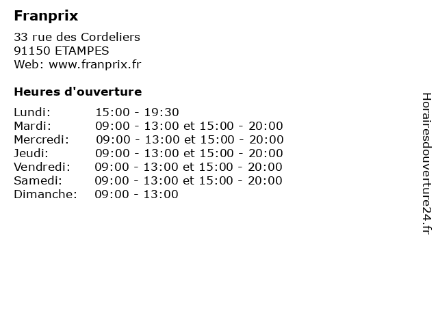1 Franprix (Distance: 0,80 km) 23-31 Rue Sainte-Croix, 91150 Étampes bibi, carte de fidélité, courses, franprix, magasin, produits frais, programme de fidélité, supermarché, épicerie 2 Franprix (Distance: 13,76 km) 17 Rue Charles De Gaulle, 91530 Saint-Chéron alimentation, franprix, fruits, legumes, superettes 3 Franprix (Distance: 15,17 km) 42 rue de Chartres, 91410 DOURDAN alimentation générale, entretien de la maison et de l'hygiène, franprix, franprix magasin, fruits et légumes frais 4 Franprix (Distance: 18,93 km) 23 Place du Marché, 91290 Arpajon bibi, carte de fidélité, courses, franprix, magasin, produits frais, programme de fidélité, supermarché, épicerie 5 Franprix (Distance: 35,58 km) - Fontaine Mouton, 92160 ANTONY alimentation générale, entretien de la maison et de l'hygiène, franprix, franprix magasin, fruits et légumes frais 6 Franprix (Distance: 41,56 km) 43 rue de Montreuil, 78000 Versailles alimentation, epicerie, franprix, supermarché |