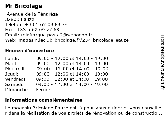 1 Mr. Bricolage (Distance: 0,61 km) n/a Avenue, 32800 Eauze baby gifts, bath, bedroom, bricolage, decorate, develop, electricity, equipment, garden, kitchen, mr., plants, tinker 2 Mr. Bricolage (Distance: 44,54 km) n/a Fleurance, 32700 Lectoure baby gifts, bath, bedroom, bricolage, decorate, develop, electricity, equipment, garden, kitchen, mr., plants, tinker 4 Mr. Bricolage (Distance: 48,84 km) . Mont de Marsan, 40990 Saint-Paul-les-Dax beaute, bricolage, cafe, chaussures, enfants, hommes, lingerie, mode femmes, mr., restaurant, sport 5 Mr Nacer Faycal (Distance: 59,10 km) 2086 Route de Sainte-Radegonde, 47240 Bon-Encontre faycal, mr, nacer 6 BigMat - Camozzi Matériaux (Distance: 46,43 km) . Rue Aimé Césaire, 32000 Auch aménagement, bigmat, bricolage, camozzi, maison, matériaux, négoce, outillage, travaux, équipement |
