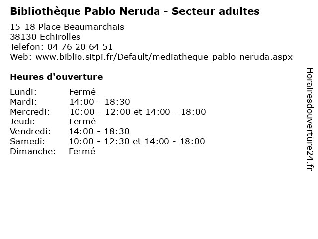 1 Bibliothèque Pablo Neruda - Du 10 juillet au 1er septembre (Distance: nan km) 15-18 Place Beaumarchais, 38130 Echirolles 10, 10juillet, 1er, au, bandes dessinées, bibliothèque, comics, du, jeunesse, juillet, littérature générale, neruda, pablo, septembre 2 Bibliothèque Pablo Neruda - Secteur jeunesse (Distance: 0,16 km) 15-18 Place Beaumarchais, 38130 Echirolles bandes dessinées, bibliothèque, comics, jeunesse, littérature générale, neruda, pablo, secteur 3 Hôpital de Jour (HdJ) adultes Cassiopée (Distance: 1,68 km) 14 Avenue Auguste Ferrier, 38130 Échirolles adultes, cassiopée, de, hdj, hôpital, jour 4 Centre Médico-Psychologique (CMP) adultes Lanteri Laura (Distance: 2,30 km) 1 Rue Dubois-Fontanelle, 38100 Grenoble adultes, centre, cmp, lanteri, laura, médico, psychologique 5 Centre Médico-Psychologique (CMP) adultes Dolto Saint-Martin-d'Hères (Distance: 3,03 km) 19 Rue Jacques Anquetil, 38400 Saint-Martin-d'Hères adultes, centre, cmp, d'hères, dolto, martin, médico, psychologique, saint 6 Centre Médico-Psychologique (CMP) adultes Bonnafé Grenoble (Distance: 3,04 km) 37 Rue de Turenne, 38000 Grenoble adultes, bonnafé, centre, cmp, grenoble, médico, psychologique |