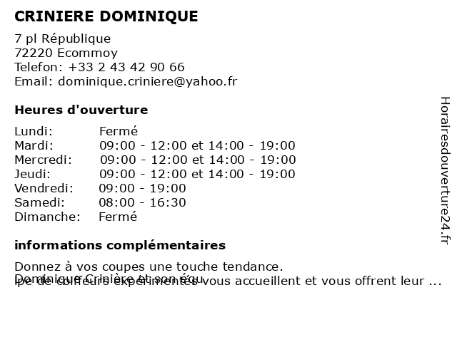| Mercredi | 09:00-12:00 et 14:00-19:00 |