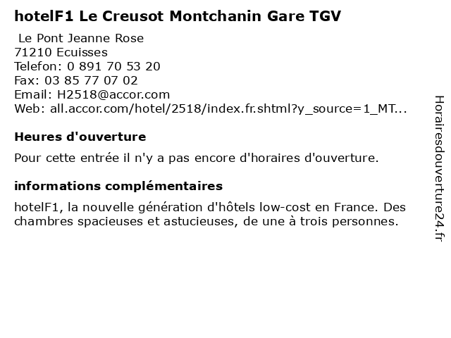 | Appeler hotelF1 Le Creusot Montchanin Gare TGV | |