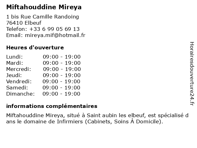 Miftahouddine Mireya, situé à Saint aubin les elbeuf, est spécialisé dans le domaine de Infirmiers (Cabinets, Soins À Domicile).