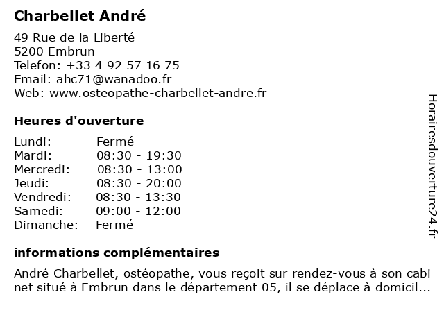 2 CHARBELLET ANDRE (Distance: 1,42 km) 1 Rue Torrent Zone Activité Entraigues, 05200 Embrun andre, charbellet 4 Lycée André Honnorat (Distance: 23,20 km) 1 Rue André Honnorat, 04400 Barcelonnette andré, education, honnorat, lycée, public, secondaire, service 5 André Plateforme D'Exploitation (Distance: 27,36 km) Le Mas du Plan, 05000 La Rochette andré, d'exploitation, plateforme 6 |