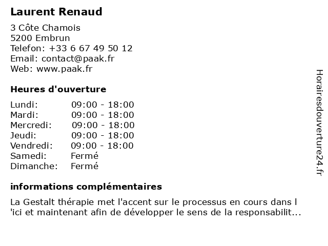 4 Le Chalet du Torrent (Distance: 15,17 km) - Cours Yves Brayer, 05560 Vars chalet, du, jacques, laurent, le, olivier, restaurants, rossi, torrent 5 Chalet Du Pre De Madame Carle (Distance: 27,71 km) Tournoux , 05290 Puy St Vincent anc, carle, ce, chalet, laurent, lieudit, madame, melezet, pre, refuge, restaurants, vernet 6 Laurent Peller Participations (Distance: 32,55 km) Place Jean Marcellin, 05000 Gap laurent, participations, peller |