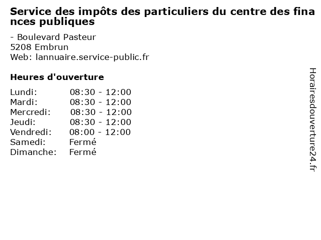 1 Service des impôts des particuliers du centre des finances publiques (Distance: 0,06 km) - Boulevard Pasteur, 05200 Embrun administration, centre, des, du, etat, finances, impots, impôts, particulier, particuliers, publiques, service 2 Trésorerie d'Embrun - Savines (Distance: 0,10 km) . Boulevard Pasteur, 05208 Embrun administration, d'embrun, finances, impots, public, publique, savines, tresor, tresorerie, trésorerie 3 Service des impôts des particuliers du centre des finances publiques (Distance: 22,93 km) 2 Avenue Ernest-Pellotier, 04400 Barcelonnette administration, centre, coeur, communauté, communes, des, du, finances, impôts, particuliers, publiques, service, services publics 4 Trésorerie de Saint-Jean-Saint-Nicolas (Distance: 24,22 km) . Saint-Jean-Saint-Nicolas, 05260 Saint-Jean-Saint-Nicolas administration, de, finances, impots, jean, nicolas, public, publique, saint, tresor, tresorerie, trésorerie 5 Trésorerie de Seyne Les Alpes (Distance: 26,01 km) - Rue de Barri, 04140 Seyne-les-Alpes administration, alpes, de, finances, impôts, les, public, publiques, seyne, trésor, trésorerie 6 Direction départementale des finances publiques (DDFIP) (Distance: 32,46 km) . Cours Ladoucette, 05007 Gap administration, alpes, assoc populations, ddfip, des, direction, départementale, finances, hautes, publics, publiques, services |