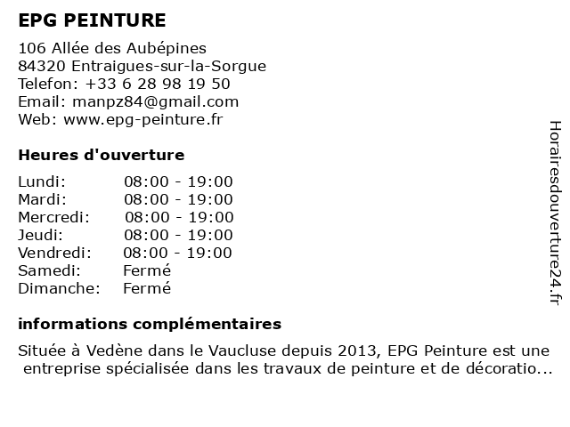 1 D.J Peinture (Distance: 3,87 km) 457 Chemin du Bac de Bompas, 84270 Vedène d.j, entreprises de peinture, peinture, réalisation de peintures intérieures 2 Entreprise de Peinture Sorguaise (Distance: 10,35 km) 16 Route de Montfavet, 84000 Avignon de, entreprise, peinture, sorguaise 3 GMD Peinture (Distance: 10,76 km) 10 Avenue de la Croix Couverte, 84210 Pernes-les-Fontaines gmd, peinture 4 Volkswagen ( Atelier Peinture Carrosserie) (Distance: 11,11 km) 1210 Avenue Dwight Eisenhower, 84200 Carpentras atelier, automobiles, carrosserie, concessionnaire, garage, motos, peinture, volkswagen 5 Peinture du Sud (Distance: 13,60 km) 540 Avenue de la 2e Division Blindée, 30133 Les Angles du, décoration, matériel, outillages, peinture, peintures, pose, sud, travaux 6 Gurafine Peinture (Distance: 14,70 km) 1201 Cheminement de la Tuilerie, 30133 Les Angles gurafine, peinture |