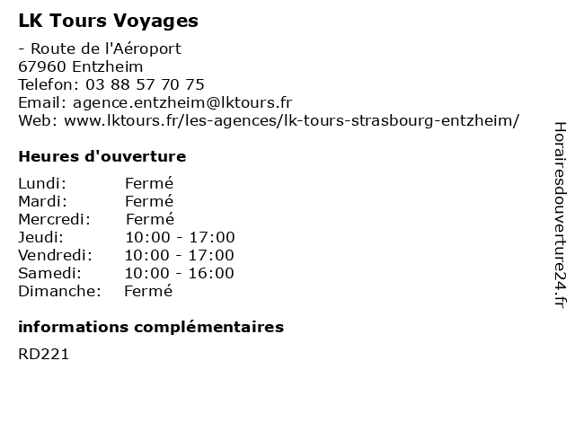 1 Selectour - LK Tours (Distance: 0,00 km) - Route départementale 221, 67960 Entzheim agence, circuits, hotel, lk, selectour, séjour, tours, voyages 2 LK Tours / Europatours (Distance: 7,56 km) 6 Route de Strasbourg, 67400 Illkirch agence, europatours, lk, tours, voyage 3 Agora Tourisme et Voyages (Distance: 9,53 km) 20 Rue du Vieux Marché aux Vins, 67000 Strasbourg agora, croisière, et, séjour, tourisme, vacances, voyage, voyages 4 Printemps Voyages (Distance: 9,72 km) 1-5 rue de la Haute Montée, 67000 Strasbourg agence, hôtel, location, printemps, séjour, voyages 5 Voyages Schmitt (Distance: 10,63 km) 1 Rue Mercure, 67120 Molsheim circuits, mer, montagne, réservation, schmitt, vacances, voyages, voyge 6 Fram Voyages (Distance: 11,12 km) - Dorlisheim, 67120 Dorlisheim agence, billet d'avion et hôtel pour votre club, fram, séjour, voyage, voyages |