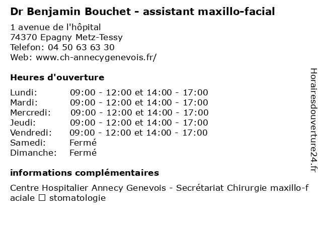 1 Dr Pierrette Bouchet - Chirurgien dentiste (Distance: 0,00 km) 1 avenue de l'hôpital, 74370 Epagny Metz-Tessy bouchet, chirurgien, consultation, dentiste, dr, handicap, handiconsult, pierrette, visio 2 Dr Benjamin Richard - cardiologue (Distance: 0,00 km) 1 avenue de l'hôpital, 74370 Epagny Metz-Tessy benjamin, cardio, cardiologie, cardiologue, coeur, dr, richard 3 Benjamin Levy - Ostéopathe (Distance: 3,56 km) 28 Rue Royale, 74000 Annecy benjamin, levy, ostéo, ostéopathe, ostéopathes, soins 5 Nagy Benjamin (Distance: 7,59 km) 1 Chemin Des Contrebandiers, 74290 Veyrier Du Lac benjamin, nagy, restaurants 6 Bouchet Alain Sarl (Distance: 11,82 km) 105 route de chez les Gris, 74570 Groisy alain, artisan, bouchet, fenêtre, fermetures, isolation, menuiserie, rénovation, sarl, vitrerie |