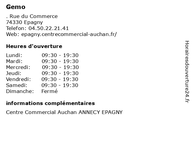1 GEMO EPAGNY Chaussures et Vêtements (Distance: 0,11 km) 615 Avenue du Centre, 74330 Epagny bijoux et accesoires, chaussures, epagny, et, gemo, lingerie, magasin bébé, maroquinerie, mode et habillement, vêtements, vêtements bébé, vêtements enfant, vêtements femme, vêtements homme 2 GEMO SEYNOD Chaussures et Vêtements (Distance: 6,97 km) 59 Boulevard Costa de Beauregard, 74600 Seynod bijoux et accesoires, chaussures, et, gemo, lingerie, magasin bébé, maroquinerie, mode et habillement, seynod, vêtements, vêtements bébé, vêtements enfant, vêtements femme, vêtements homme 3 GEMO GRESY SUR AIX Chaussures et Vêtements (Distance: 27,47 km) Route des Bauges, 73100 Grésy-sur-Aix aix, bijoux et accesoires, chaussures, et, gemo, gresy, lingerie, magasin bébé, maroquinerie, mode et habillement, sur, vêtements, vêtements bébé, vêtements enfant, vêtements femme, vêtements homme 4 GEMO ANNEMASSE Chaussures et Vêtements (Distance: 31,38 km) 31 Route de Thonon, 74100 Annemasse annemasse, bijoux et accesoires, chaussures, et, gemo, lingerie, magasin bébé, maroquinerie, mode et habillement, vêtements, vêtements bébé, vêtements enfant, vêtements femme, vêtements homme 5 GEMO BELLEY Chaussures et Vêtements (Distance: 35,18 km) Z.A. de l'Ousson, 01300 Belley belley, bijoux et accesoires, chaussures, et, gemo, lingerie, magasin bébé, maroquinerie, mode et habillement, vêtements, vêtements bébé, vêtements enfant, vêtements femme, vêtements homme 6 GEMO GILLY SUR ISERE Chaussures et Vêtements (Distance: 38,43 km) Z.A. le Grand Pré, 73200 Gilly-sur-Isère bijoux et accesoires, chaussures, et, gemo, gilly, isere, lingerie, magasin bébé, maroquinerie, mode et habillement, sur, vêtements, vêtements bébé, vêtements enfant, vêtements femme, vêtements homme |