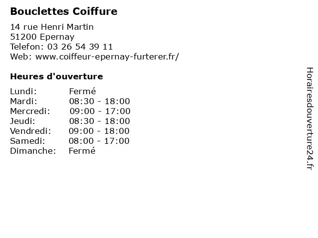 1 Salon Bouclettes (Distance: 0,02 km) 14 Rue Henri Martin, 51200 Épernay beauté, bouclettes, coiffure, salon, style 2 Atten' Tif Coiffure Epernay (Distance: 0,20 km) 51 Rue de l'Hôpital Auban - Moët, 51200 Épernay atten', coiffure, epernay, tif 4 Tchip Coiffure (Distance: 0,22 km) 27 Rue Eugène Mercier, 51200 Epernay beaute, coiffure, salon, tchip 6 Shop Coiffure (Distance: 0,60 km) 11 rue porte Lucas, 51200 Epernay aménagement de la maison, beauté, coiffeur, coiffure, equipement de la maison, maquillage, parfumerie, services, services à la personne, shop, soins |