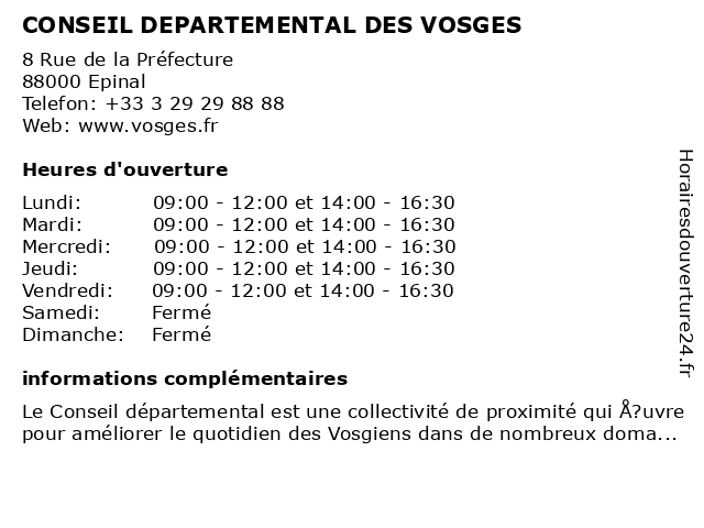 1 Paierie départementale - Vosges (Distance: 0,04 km) 5 avenue Gambetta, 88011 Epinal administration, association, déclarations, départementale, emplois, employeurs, paierie, travails, vosges 3 Conseil départemental des Vosges - Prêts à bosser (Distance: 0,09 km) 5 Avenue Gambetta, 88000 Épinal bosser, conseil, des, départemental, prêts, vosges 4 Conseil département des Vosges : Accueil tourisme (Distance: 0,16 km) 1 Rue Gilbert, 88000 Épinal accueil, conseil, des, département, tourisme, vosges 5 URBAM Conseil (Distance: 0,17 km) 5 Rue Thiers, 88000 Épinal collectivités, conseil, indépendante, pluridisciplinaire, service, société, urbam 6 Je vois la Vie en Vosges (Distance: 0,17 km) 1 Rue Gilbert, 88000 Épinal en, je, la, vie, vois, vosges |