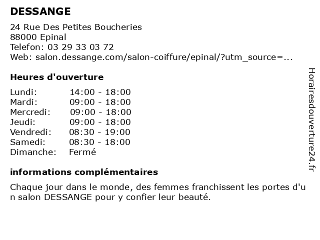 1 DESSANGE F.Pierrat Franchisé indépendant (Distance: 39,12 km) 6 place St Martin, 88100 Saint dié des vosges dessange, f.pierrat, franchisé, indépendant 2 Athénais Coiffure (Distance: 0,09 km) 9 Rue de Léopold Bourg, 88000 Epinal athénais, beauté, coiffure, coiffures, coloristes 3 Divinaura (Distance: 0,14 km) 4 Rue de Léopold Bourg, 88000 Epinal beauté, coiffure, coiffures, coloristes, divinaura 4 Qipao (Distance: 0,14 km) 3 rue de Léopold Bourg, 88000 Epinal beauté, femmes, instituts, qipao, soins cuisine rendez vous 5 Salon Alessandro - Femme (Distance: 0,16 km) 5 Quai du Maréchal de Contades, 88000 Epinal alessandro, beauté, coiffeur, coiffure, femme, institut, salon 6 L'Atelier de Jen (Distance: 0,26 km) 8 Rue Georges de la Tour, 88000 Epinal atelier, beauté, coiffure, coiffures, coloristes, de, jen, l', l'atelier |