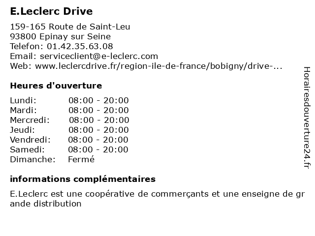 1 E.Leclerc Drive (Distance: 4,09 km) 20 rue de Sarcelles, 95410 Groslay courses, distribution, drive, e.leclerc, grande, leclerc 2 E.Leclerc Drive (Distance: 5,45 km) 21 rue Jules Michelet, 92700 Colombes alimentation, drive, e.leclerc, supermarché 3 E.Leclerc Drive (Distance: 8,11 km) 77 Rue d'Ermont, 95390 Saint-Prix alimentation, drive, e.leclerc, supermarché 4 E.Leclerc Drive (Distance: 9,64 km) route Nationale 1, 95570 Moisselles alimentation, drive, e.leclerc, supermarché 5 E.Leclerc Drive (Distance: 9,73 km) 1 avenue Armand Esders, 93150 Le Blanc Mesnil alimentation, drive, e.leclerc, supermarché 6 E.Leclerc Drive (Distance: 13,13 km) 81-87 Boulevard National, 92500 Rueil-Malmaison alimentation, drive, e.leclerc, supermarché |