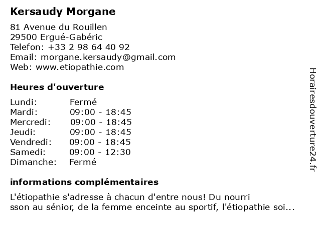 1 Morgane Cossec - Masseur-kinésithérapeute (Distance: 3,15 km) 14 bis avenue Yves Thépot, 29000 Quimper consultation, cossec, docteur, kinésithérapeute, masseur, med, medecine, medical, morgane, médecin, traitement 2 Morgane Hugon - Masseur-kinésithérapeute (Distance: 3,15 km) 14 bis avenue Yves Thépot, 29000 Quimper consultation, docteur, hugon, kinésithérapeute, masseur, med, medecine, medical, morgane, médecin, traitement 4 Kersaudy Erwan Ostéopathe Animalier et Humain (Distance: 9,23 km) 6 Rue de Guengat, 29700 Pluguffan animalier, erwan, et, humain, kersaudy, ostéopathe 5 Morgane - La Boutique de Blandine (Distance: 12,37 km) 3 Place du Marche, 29510 Briec blandine, boutique, de, la, morgane 6 Morgane Le Maitre - Psychologue (Distance: 16,15 km) 36 Rue des Sables Blancs, 29900 Concarneau le, maitre, morgane, psy, psychiatre, psychologue, sante, soins |