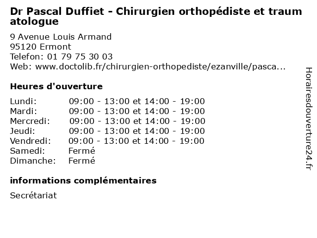 1 Dr Pascal Duffiet - Chirurgien orthopédiste et traumatologue (Distance: 15,30 km) 34 Avenue du Général Sarrail, 75016 Paris chirurgien, consultation, docteur, dr, duffiet, et, med, médecin, médecine, orthopédiste, pascal, traitement, traumatologue 2 Dr Erwan Pansard - Chirurgien orthopédiste - secrétariat (Distance: 0,04 km) 9 Avenue Louis Armand, 95120 Ermont chirurgien, chirurgien orthopédiste, dr, erwan, médecins, médicaments, orthopédiste, pansard, santé, secrétariat, spécialiste 3 Dr Souad El Batti - Chirurgien orthopédiste et traumatologue (Distance: 0,04 km) 9 Avenue Louis Armand, 95120 Ermont batti, chirurgien, consultation, docteur, dr, el, et, med, médecin, médecine, orthopédiste, souad, traitement, traumatologue 4 Dr Nicolas Billot - Chirurgien orthopédiste et traumatologue (Distance: 0,04 km) 9 Avenue Louis Armand, 95120 Ermont billot, chirurgien, consultation, docteur, dr, et, med, médecin, médecine, nicolas, orthopédiste, traitement, traumatologue 5 Dr Oleg Botcharov - Chirurgien orthopédiste et traumatologue (Distance: 2,28 km) 14 Rue de Saint-Prix, 95602 Eaubonne botcharov, chirurgien, consultation, docteur, dr, et, med, médecin, médecine, oleg, orthopédiste, traitement, traumatologue 6 Dr Lidia de Abreu - Chirurgien orthopédiste et traumatologue (Distance: 2,28 km) 14 Rue de Saint-Prix, 95602 Eaubonne abreu, chirurgien, consultation, de, docteur, dr, et, lidia, med, médecin, médecine, orthopédiste, traitement, traumatologue |