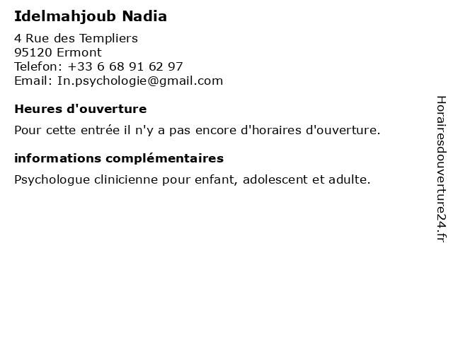 2 Nadia Mezhoud Cabinet Infirmier (Distance: 3,00 km) 34 Rue de la Folie, 95100 Argenteuil cabinet, infirmier, mezhoud, nadia 3 Dr Nadia Fatah-Bendjelid - Pédiatre (Distance: 3,60 km) 17 Avenue de Paris, 95230 Soisy-sous-Montmorency bebe, bendjelid, dr, fatah, nadia, nourisson, pédiatre, pédiatrie 4 Dr. Fatah Nadia - Pédiatre (Distance: 3,73 km) 2 Avenue Louis Blanc, 95230 Soisy-sous-montmorency docteur, dr., fatah, medecins, nadia, pédiatre, sante 5 Dr. Nadia Fatah - Pédiatrie (Distance: 3,73 km) 2 avenue louis Blanc, 95230 Soisy sous montmorency consultation, docteur, dr., fatah, nadia, pédiatrie, santé 6 Dr. Nadia Fatah - Pédiatrie(Consultation sur rendez-vous) (Distance: 3,73 km) 2 avenue louis Blanc, 95230 Soisy sous montmorency consultation, docteur, dr., fatah, nadia, pédiatrie, rendez, santé, sur, vous |