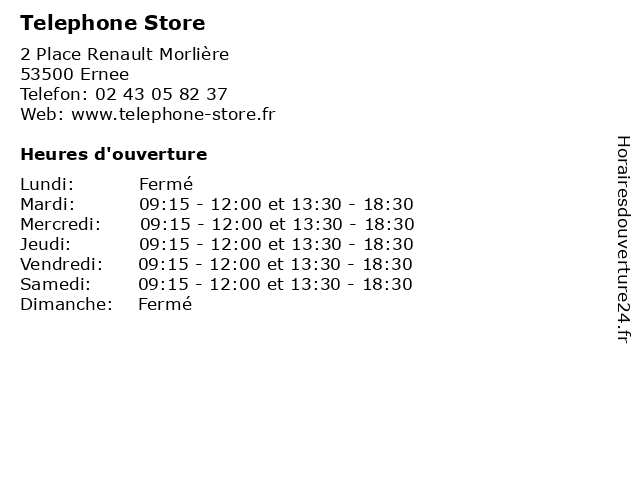 1 Store Fougères (Distance: 19,77 km) - Forum de la Gare, 35300 Fougeres accessoires, boutique, femme, fougères, mode, store, vêtements 2 Presscom Coriolis - Télécom (Distance: 0,19 km) 9 Boulevard du Général Duvivier, 53500 Ernée coriolis, magasin, mobile, mobiles, presscom, télécom, téléphones, téléphonie 3 SFR (Distance: 20,39 km) 11 Boulevard Jean Jaurès,, 35300 Fougeres abonnements de téléphonie mobile ou fixe fixe ou carte prépayée, accès internet haut débit ou la fibre optique ainsi que des abonnements à des bouquets de chaînes de télévision ., sfr, téléphones mobiles 4 SFR (Distance: 23,44 km) 36 Place Georges Clémenceau, 53100 Mayenne abonnements de téléphonie mobile ou fixe fixe ou carte prépayée, accès internet haut débit ou la fibre optique ainsi que des abonnements à des bouquets de chaînes de télévision ., sfr, téléphones mobiles 5 BOUYGUES TELECOM (Distance: 23,44 km) 36 Place Georges Clemenceau, 53100 Mayenne 5g, accessoires, acheter téléphone, apple, boutique bouygues telecom, bouygtel, bouygue, bouygue telecom, bouygues, bouygues telecom, bouygues telephone, bouygues télécom, bouyguestelecom, box internet, fibre, fibre optique, fixe, forfait mobile, fournisseur d'accès à internet, internet, internet haut débit, iphone, magasin bouygues, offres fixes, offres groupées, offres internet, opérateur, opérateur fixe, opérateur mobile, raccordement fibre optique haut débit (ftth), reprise mobile, réparation mobile, samsung, samsung galaxy, smartphones, telecom, télécommunication, téléphonie, téléphonie fixe, télévision 6 SFR Laval La Mayenne (Distance: 26,17 km) C Cial Carrefour La Mayenne, 53000 Laval compagnie de téléphone, la, laval, magasin de téléphones mobiles, mayenne, sfr, vente et installation du câble et du satellite |