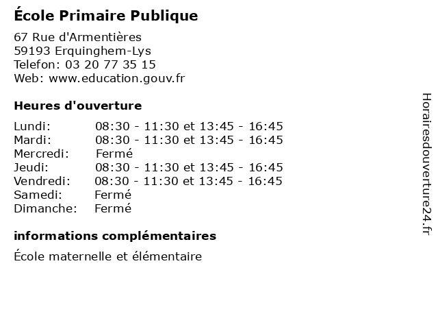 1 École Primaire Publique (Distance: 3,74 km) . Place des trois Maires, 59280 Bois-Grenier cours, education, primaire, publique, services, école 2 École Primaire Publique (Distance: 7,79 km) 94 Rue des Écoles, 59840 Prémesques cours, education, primaire, publique, services, école 3 École Primaire Publique (Distance: 8,04 km) 32 Rue du Bourg, 59320 Ennetières-en-Weppes cours, education, primaire, publique, services, école 4 École Primaire Publique (Distance: 8,07 km) 7 Rue de Verdun, 59249 Fromelles cours, education, primaire, publique, services, école 5 École Primaire Publique (Distance: 8,87 km) 2 Rue Ennetieres, 59160 Capinghem cours, education, primaire, publique, services, école 6 École Primaire Publique (Distance: 9,06 km) 2432 Rue du Grand, 59253 La Gorgue cours, education, primaire, publique, services, école |