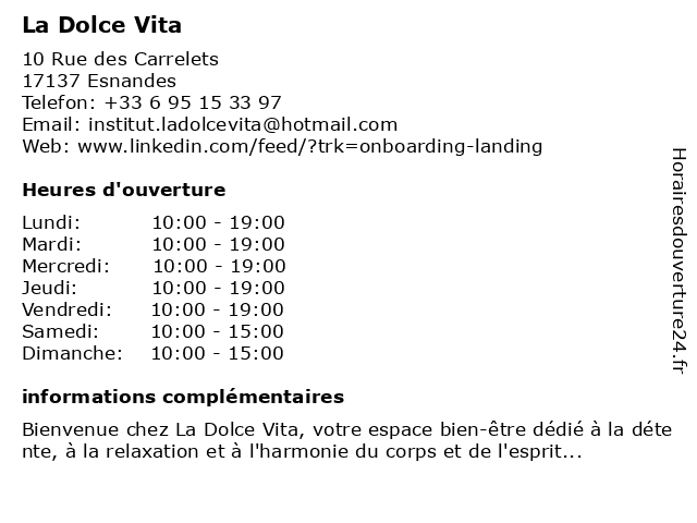 2 Axea Vita (Distance: 12,23 km) 10-14 rue Jean perrin, 17000 La Rochelle axea, services, services à la personne, vita 3 Le Recif (Distance: 34,58 km) 1255 Avenue Du Docteur Mathevet, 85560 Longeville Sur Mer dolce, recif, restaurants, vita 4 La Dolce Vita (Distance: 35,38 km) 37 Rue Saint Jean, 17190 Saint-Georges-d'Oléron dolce, la, pizza, pizzeria, restaurant, restauration, vita 5 Restaurant La Dolce Vita (Distance: 50,96 km) 46 Rue Saint-Jean, 79000 Niort dolce, italien, la, restaurant, restauration, traiteur, vita |