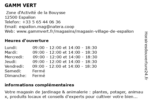| 3 Gamm Vert (Distance: 14,70 km) n/a Route de Villecomtal, 65190 Bordes automobile, centre auto, dépannage, entretien, gamm, garage, nettoyage, pièces techniques, pneus, réparation, transport, tuning et accessoires, vert, équipement intérieur / extérieur auto 5 GAMM VERT (Distance: 17,14 km) Pont de Palmas, 12310 Laissac animalerie, animaux, gamm, jardinage, plantes, potager, produits locaux, vert 6 |