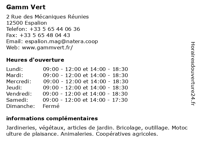 | 1 GAMM VERT (Distance: 0,01 km) Zone d'Activité de la Bouysse, 12500 Espalion animalerie, animaux, gamm, jardinage, plantes, potager, produits locaux, vert 3 Gamm Vert (Distance: 14,70 km) n/a Route de Villecomtal, 65190 Bordes automobile, centre auto, dépannage, entretien, gamm, garage, nettoyage, pièces techniques, pneus, réparation, transport, tuning et accessoires, vert, équipement intérieur / extérieur auto 5 GAMM VERT (Distance: 17,15 km) Pont de Palmas, 12310 Laissac animalerie, animaux, gamm, jardinage, plantes, potager, produits locaux, vert 6 |
