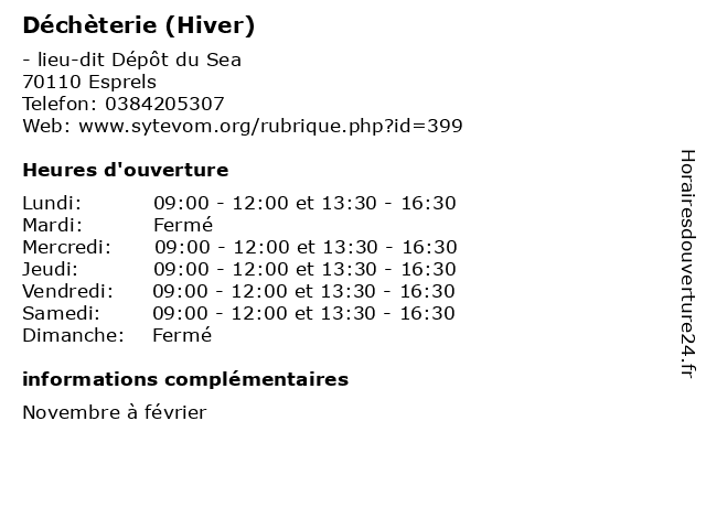 1 Déchèterie (Hiver) (Distance: 6,58 km) - lieu-dit Devant-les-Cuisottes, 25680 Rougemont bennes, débarras, déchèterie, détritus, hiver, ordures 2 Déchèterie (Hiver) (Distance: 8,20 km) - lieu-dit Village de Presle, 70230 Dampierre-Sur-Linotte bennes, débarras, déchèterie, détritus, hiver, ordures, poubelles 3 Déchèterie (Hiver) (Distance: 13,60 km) - route de Neurey la Demie, 70000 Quincey bennes, débarras, déchèterie, détritus, hiver, ordures, poubelles 4 Déchèterie (Hiver) (Distance: 14,82 km) n/c route de Velleminfroy, 70240 Saulx bennes, débarras, déchèterie, détritus, hiver, ordures, poubelles 5 Déchèterie (Hiver) (Distance: 15,60 km) - lieu-dit des Combes de Fontaine, 25340 Clerval bennes, débarras, déchèterie, détritus, hiver, ordures 6 Déchèterie (Hiver) (Distance: 18,09 km) - route départementale 683, 25250 Isle-sur-le-Doubs bennes, débarras, déchèterie, détritus, hiver, ordures |