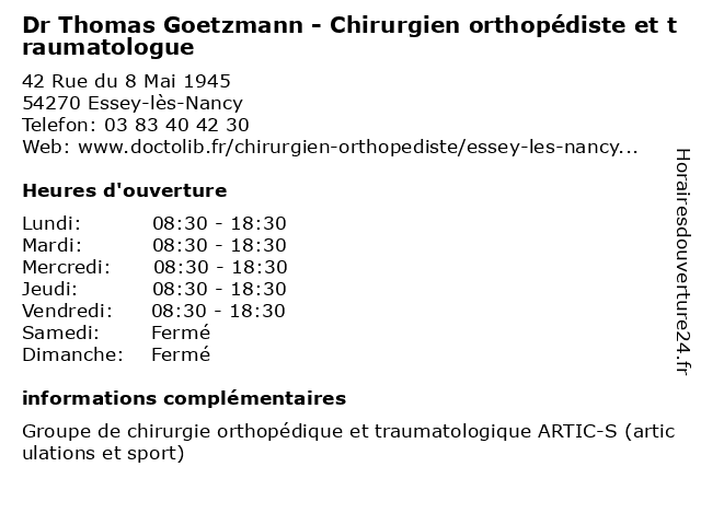 1 Dr Frank Wein - Chirurgien orthopédiste et traumatologue (Distance: 0,00 km) 42 Rue du 8 Mai 1945, 54270 Essey-lès-Nancy chirurgien, consultation, docteur, dr, et, frank, med, médecin, médecine, orthopédiste, secrétariat, traitement, traumatologue, wein 2 Dr Adrien Jacquot - Chirurgien orthopédiste et traumatologue (Distance: 0,00 km) 42 Rue du 8 Mai 1945, 54270 Essey-lès-Nancy adrien, chirurgien, consultation, docteur, dr, et, jacquot, med, médecin, médecine, orthopédiste, secrétariat, traitement, traumatologue 3 Pr Daniel Mole - Chirurgien orthopédiste et traumatologue (Distance: 0,00 km) 42 Rue du 8 Mai 1945, 54270 Essey-lès-Nancy chirurgien, consultation, daniel, docteur, et, med, mole, médecin, médecine, orthopédiste, pr, secrétariat, traitement, traumatologue 4 Dr Paul Walbron - Chirurgien orthopédiste et traumatologue (Distance: 0,32 km) 42 Rue du 8 Mai 1945, 54270 Essey-lès-Nancy chirurgie, chirurgien, dr, et, general, orthopédiste, paul, soins, traumatologue, walbron 5 Dr Romain Detammaecker - Chirurgien orthopédiste et traumatologue (Distance: 0,32 km) 42 Rue du 8 Mai 1945, 54270 Essey-lès-Nancy chirurgie, chirurgien, detammaecker, dr, et, general, orthopédiste, romain, soins, traumatologue 6 Dr Jérôme Diligent - Chirurgien orthopédiste et traumatologue (Distance: 0,32 km) 42 Rue du 8 Mai 1945, 54270 Essey-lès-Nancy chirurgien, consultation, diligent, docteur, dr, et, jérôme, med, médecin, orthopédiste, traitement, traumatologue |