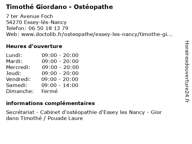 1 Timothé Giordano - Ostéopathe (Distance: 25,87 km) 4 Place de L Hôtel de ville, 54330 Vézelise giordano, ostéo, ostéopathe, ostéopathes, soins, timothé 2 Dias Giordano Maria (Distance: 58,61 km) 7 Clos Sous Vallieres, 54800 Hatrize dias, giordano, maria, restaurants 3 Dr Odile Weissenbacher - Médecin généraliste (Distance: 0,07 km) 15 Avenue Foch, 54270 Essey-lès-Nancy docteur, dr, generaliste, généraliste, medecin, médecin, odile, soins, weissenbacher 4 Julien Clausse - Ostéopathe (Distance: 0,07 km) 20B Avenue Foch, 54270 Essey-lès-Nancy clausse, julien, osteo, osteopathe, ostéopathe, sante, soins 5 Dr Sébastien Tretou - Chirurgien viscéral et digestif (Distance: 0,07 km) 7 Rue Parmentier, 54270 Essey-lès-Nancy chirurgie, chirurgien, digestif, dr, et, general, soins, sébastien, tretou, viscéral 6 Dr Alexis Tatopoulos - Anesthésiste réanimateur (Distance: 0,07 km) 7 Rue Parmentier, 54270 Essey-lès-Nancy alexis, anes, anesthesiste, anesthésiste, docteur, dr, réanimateur, soins, tatopoulos |