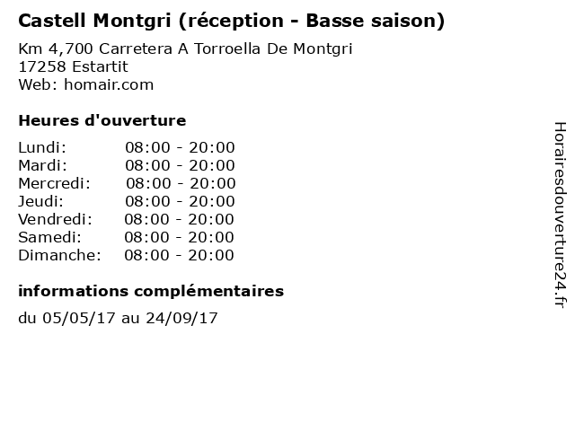 Termes de recherche pour Castell Montgri (réception - Basse saison):basse, camping, saison, location, tourisme, réception, castell, centre de vacances, hébergements, montgri |
