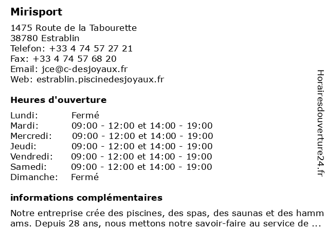 1 Piscines Desjoyaux - Mirisport (été) (Distance: 1,57 km) - La Tabourette, 38780 Estrablin de, desjoyaux, fitness, mirisport, musculation, piscines, salle, sport, été 4 Piscines Desjoyaux - Mirisport (hiver) (Distance: 28,97 km) 31 Route de Grenoble, 38300 Bourgoin Jailleu de, desjoyaux, fitness, hiver, mirisport, musculation, piscines, salle, sport |
