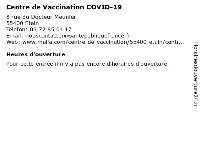 1 Centre de Vaccination COVID-19 - MSP (Distance: 13,11 km) 16bis Rue des Eparges, 55160 Fresnes-en-Woëvre 19, centre, covid, covid 19, covid19, de, msp, médecin, médecine, médical, test, vaccin, vaccination, vaccins 2 Centre de Vaccination COVID-19 - MSP (Distance: 13,57 km) 9 Chemin du Mont, 55230 Spincourt 19, centre, covid, covid 19, covid19, de, msp, médecin, médecine, médical, test, vaccin, vaccination, vaccins 3 Centre de Dépistage Covid-19 Labry (Distance: 17,83 km) 18 Z.A.C. Geslin, 54800 Labry 19, centre, centre covid, centre de dépistage, coronavirus, covid, covid19, de, dépistage, laboratoire, laboratoire d analyse médicale, labry, résultats, sérologie, test covid, test pcr 4 Centre de Vaccination COVID-19 - Salle Cassin (Distance: 19,70 km) - Allee du Pre l'Eveque, 55100 Verdun 19, cassin, centre, covid, covid 19, covid19, de, médecin, médecine, médical, salle, test, vaccin, vaccination, vaccins 5 Centre de Vaccination COVID-19 (Distance: 35,82 km) - Rue de Lorraine, 54400 Longwy 19, centre, covid, covid 19, covid19, de, médecin, médecine, médical, test, vaccin, vaccination, vaccins 6 Centre de Vaccination COVID-19 - Centre Hospitalier (Distance: 37,66 km) 4 Rue Alfred Labbé, 54350 Mont-Saint-Martin 19, centre, covid, covid 19, covid19, de, hospitalier, médecin, médecine, médical, test, vaccin, vaccination, vaccins |